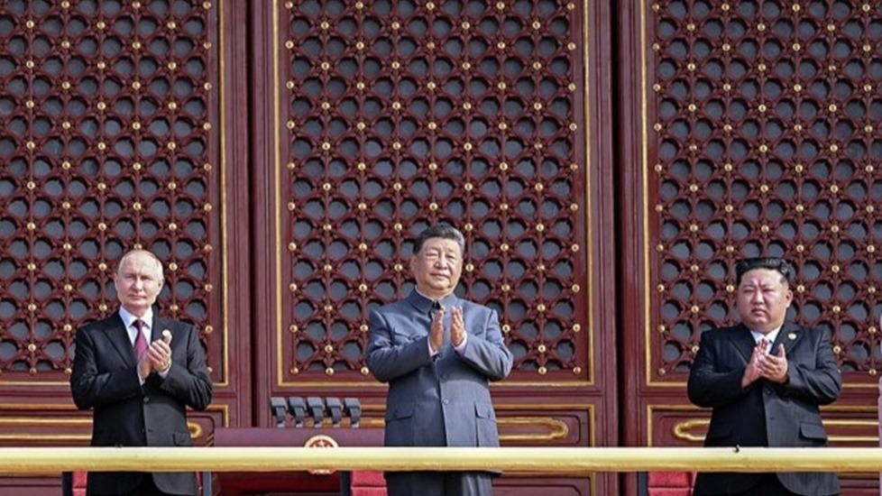 北京の天安門で並び立つプーチン大統領、習近平主席、金正恩総書記(朝鮮中央通信から)