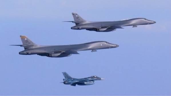 先月30日に朝鮮半島に飛来した戦略爆撃機「B−1B](上2機)