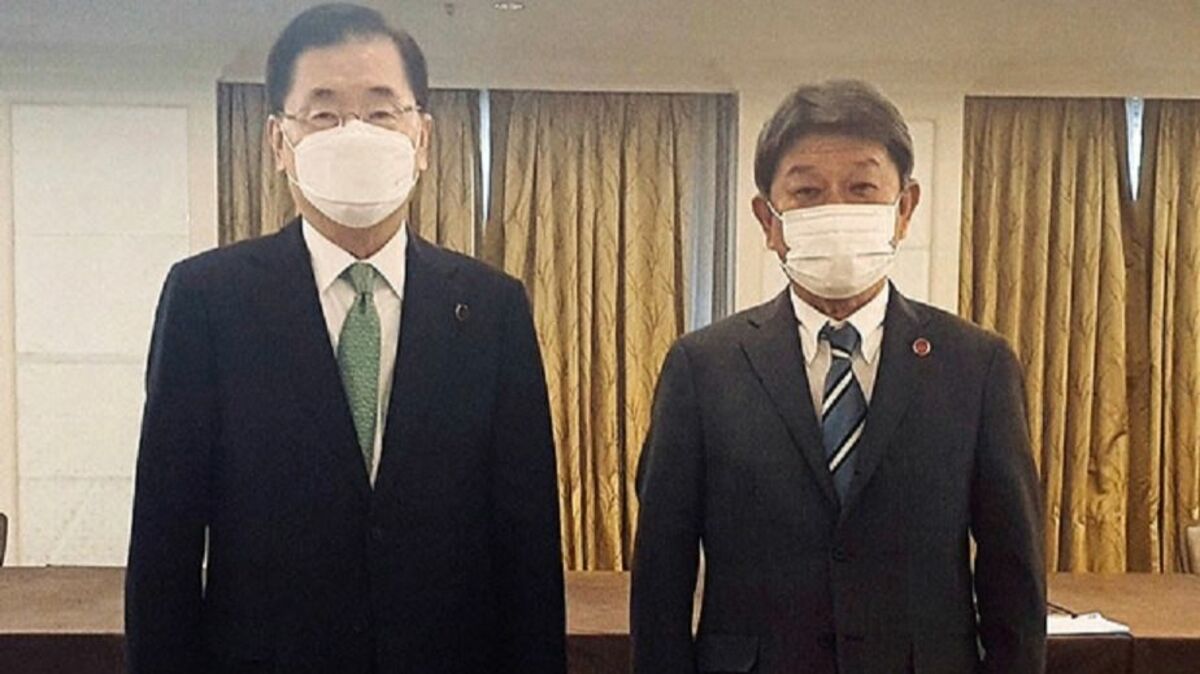 韓国の外相が今年2月に前任の康京和氏から鄭義溶氏に替わっての初の会談だったが、茂木敏充と鄭義溶外相は初対面にもかかわらず、握手はおろか、肘合わせ挨拶もしなかった。また、公式会談であるにもかかわらず会場には国旗も掲げられていなかった。