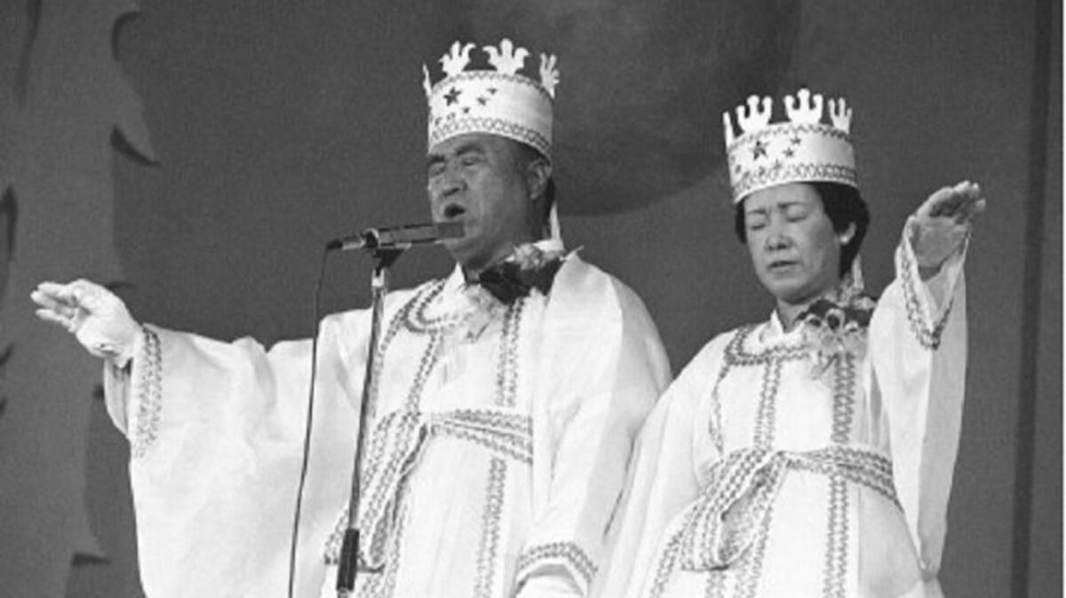 統一教会の創始者・故文鮮明総裁(左)と後継者の韓鶴子夫人(教会PRパンフから)