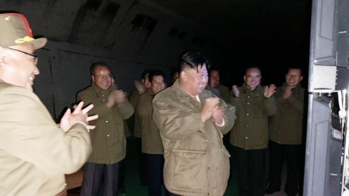新型長距離巡航ミサイルの発射成功に大喜びしている金正恩総書記(朝鮮中央通信から)