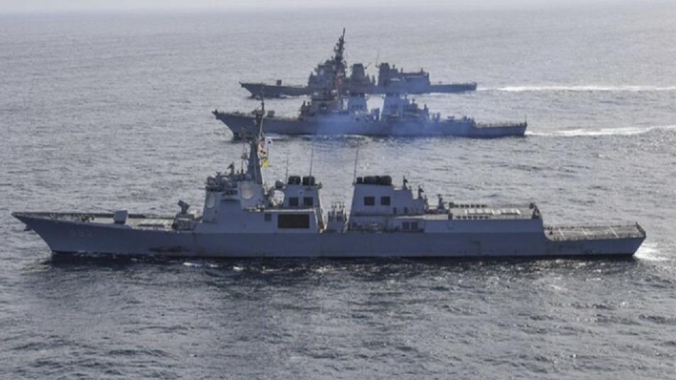 日米韓のイージス艦によるミサイル警報訓練(韓国海軍配信)