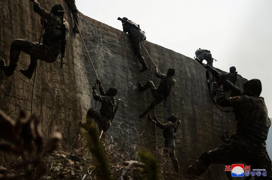北朝鮮が配信した写真には落下傘部隊が輸送機から敵陣に飛び降りる場面から軍事対象物を制圧するためロープを使って上る場面、さらには射撃を加える場面などが写し出されていた。