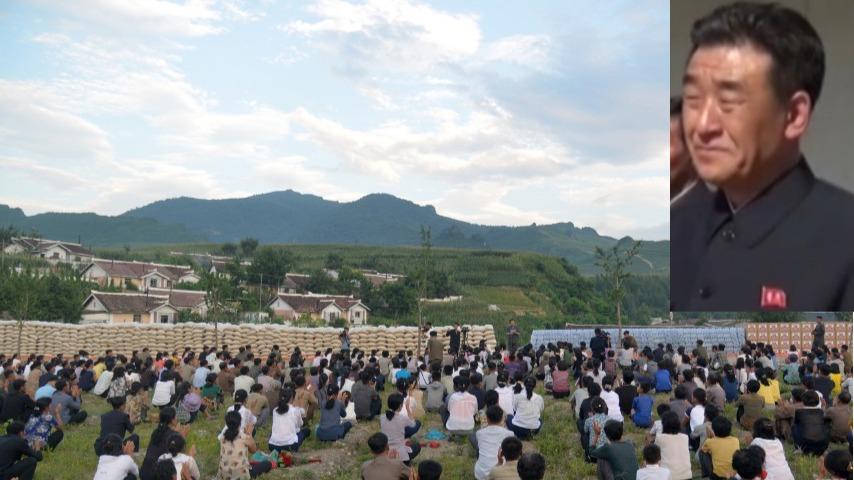 救援物資を求め集った慈江道の被災者と姜鳳勲党書記(労働新聞から筆者キャプチャー)