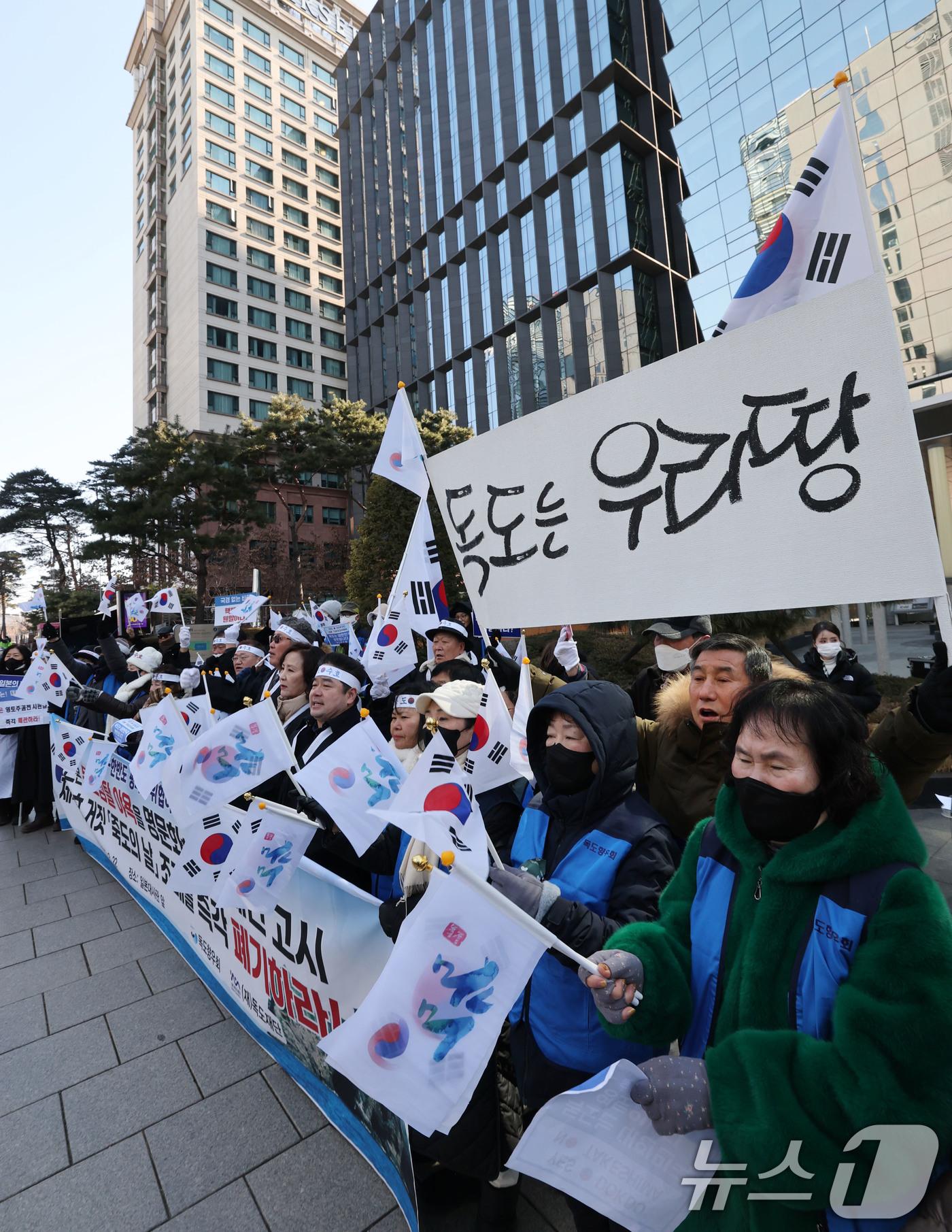 「独島は我が領土」の横断幕を掲げた駐韓日本大使館前での抗議集会(韓国「ニュース1」からキャプチャー)